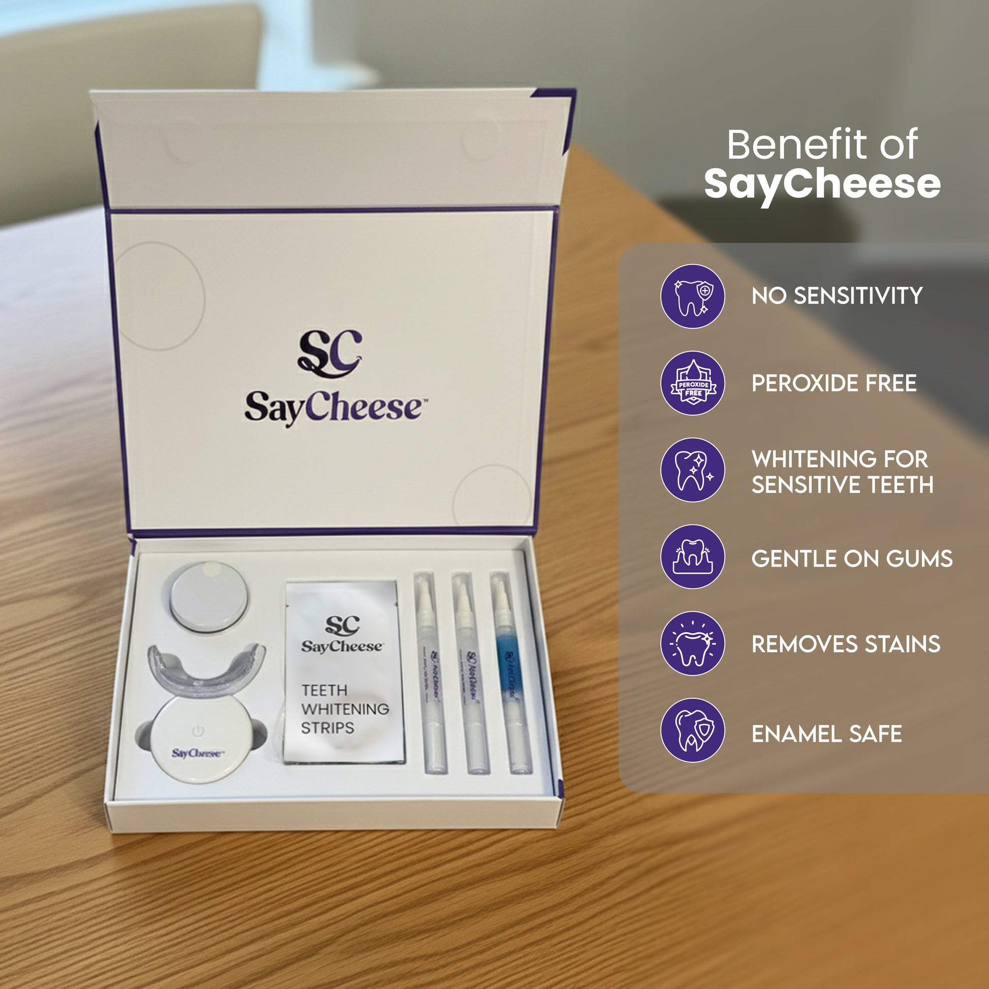 SayCheese Ascend Non-Sensitive is built for teeth that tolerate peroxide well — using hydrogen peroxide and carbamide peroxide, the same Advanced actives trusted in many professional whitening systems. The difference is how intentional we’ve made the at-home experience.